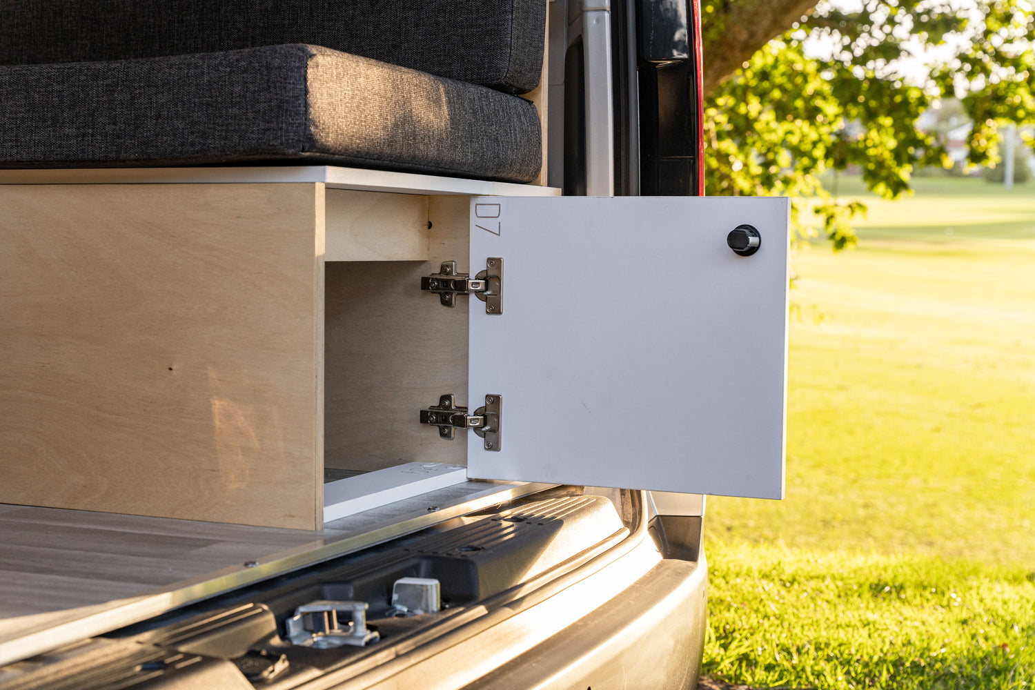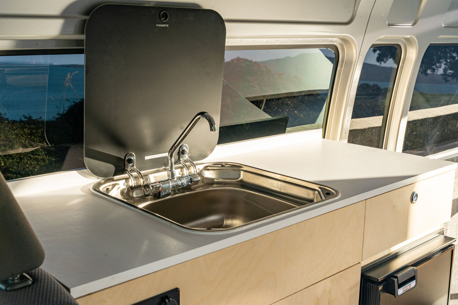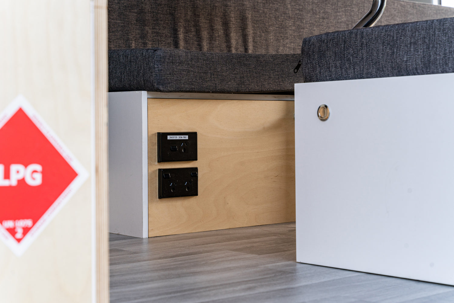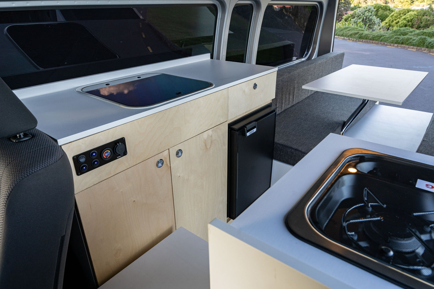 We also installed a full self-containment system, upgraded to a 240Ah AGM battery, and built the cabinetry using sealed birch ply with a white HPL benchtop finish.