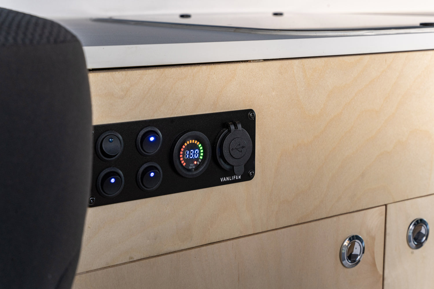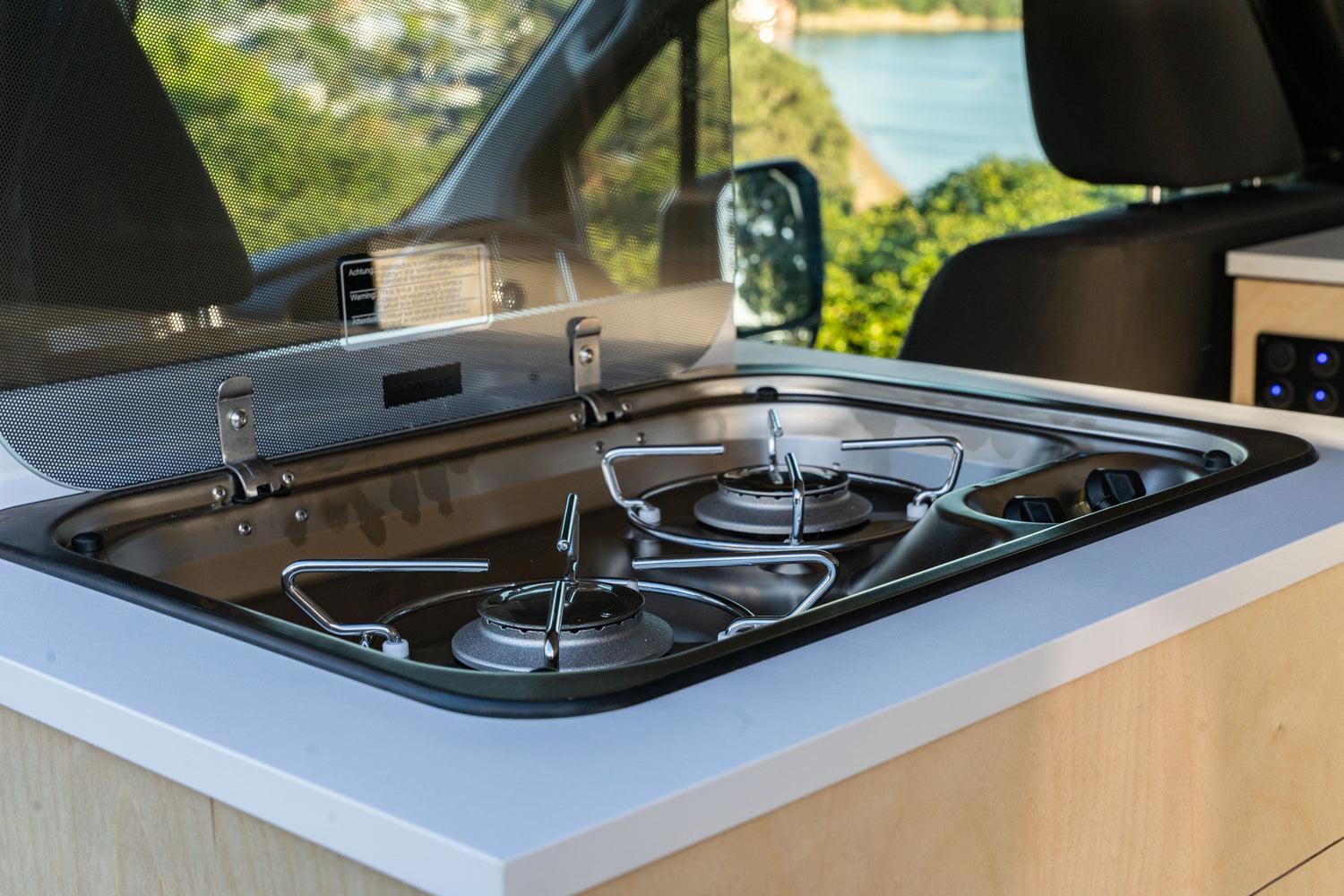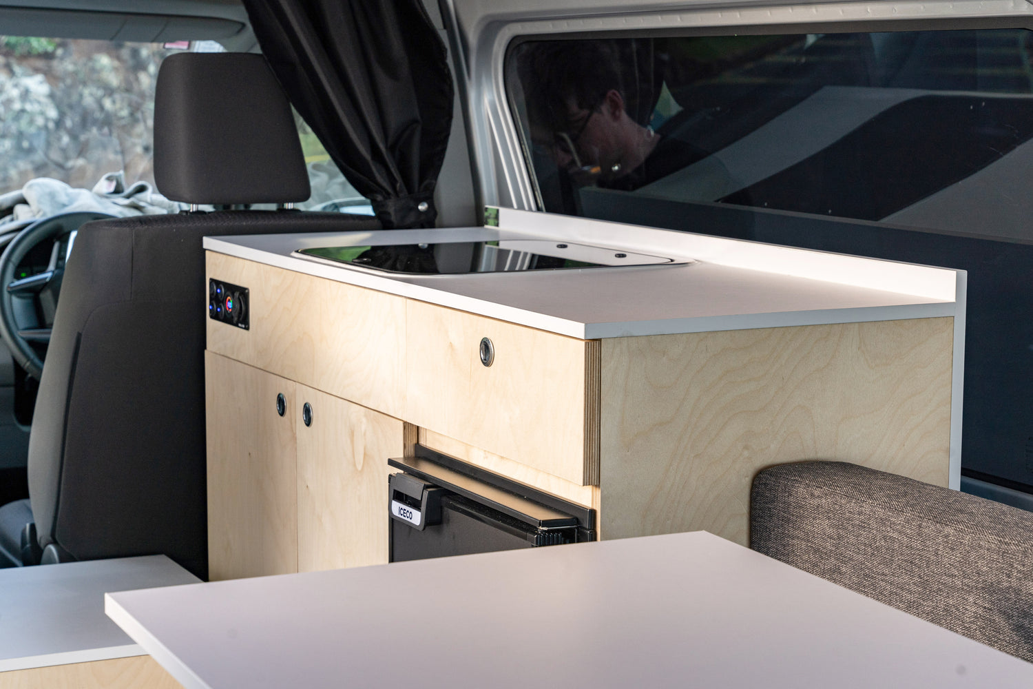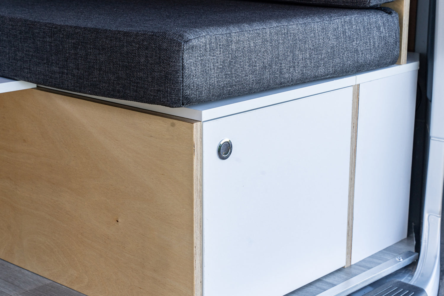 We also installed a full self-containment system, upgraded to a 240Ah AGM battery, and built the cabinetry using sealed birch ply with a white HPL benchtop finish.