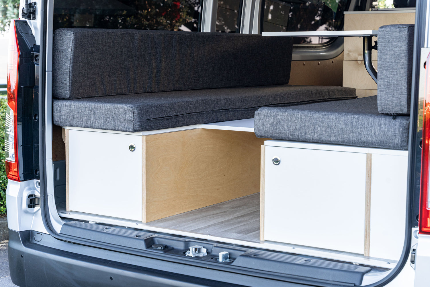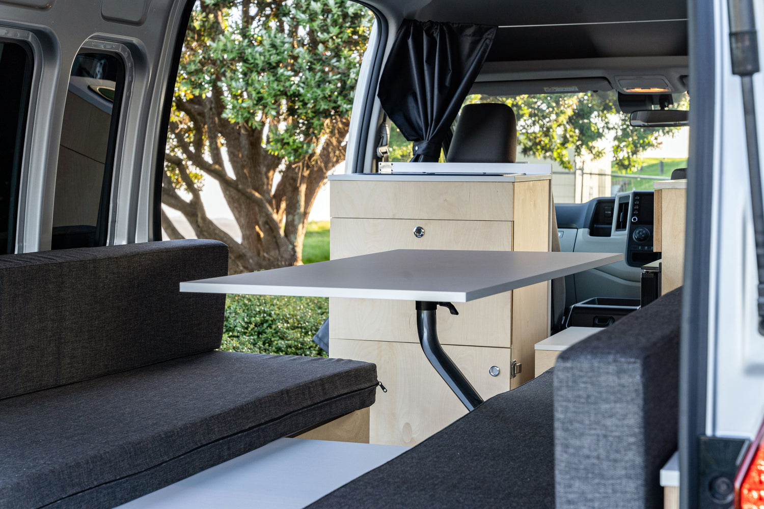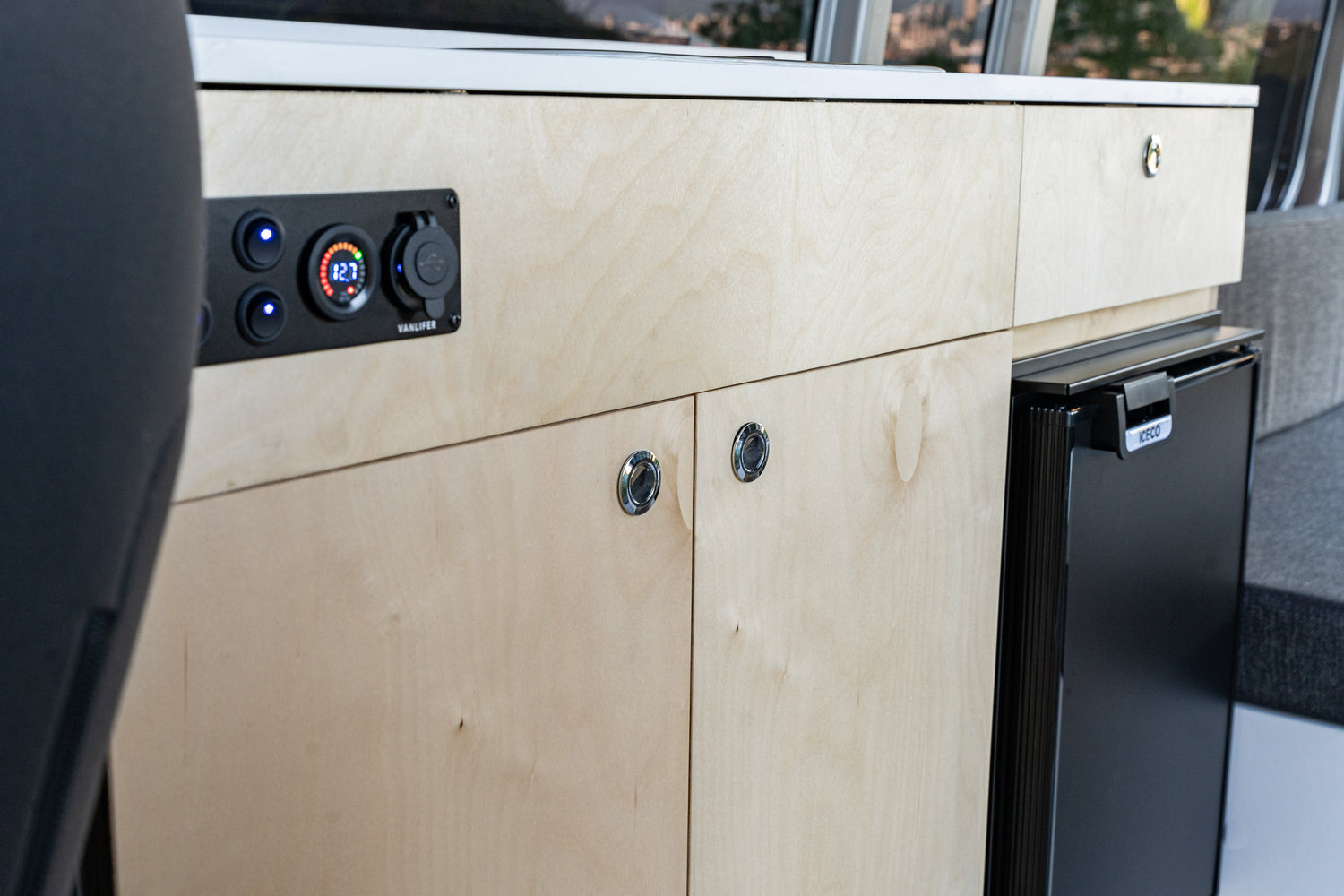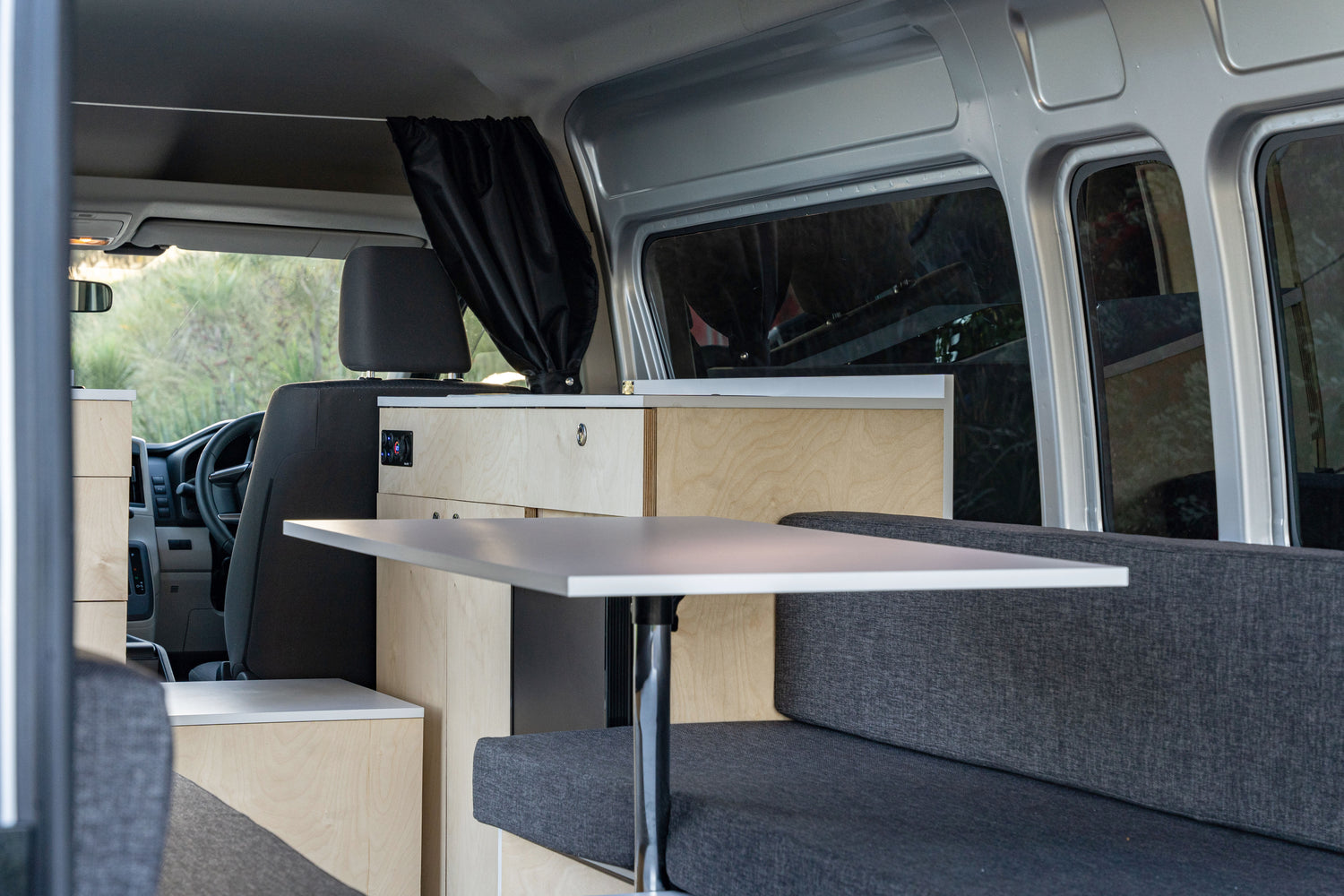 Mike and Rhonda selected a 49L 12V fridge / freezer, which we installed with a precise cabinetry cut-out. Curtains were custom-made with a combination of magnets and suction cups. For upholstery, they opted for premium squabs, though we later swapped out some panels and altered the cushion zips to suit their preferences.