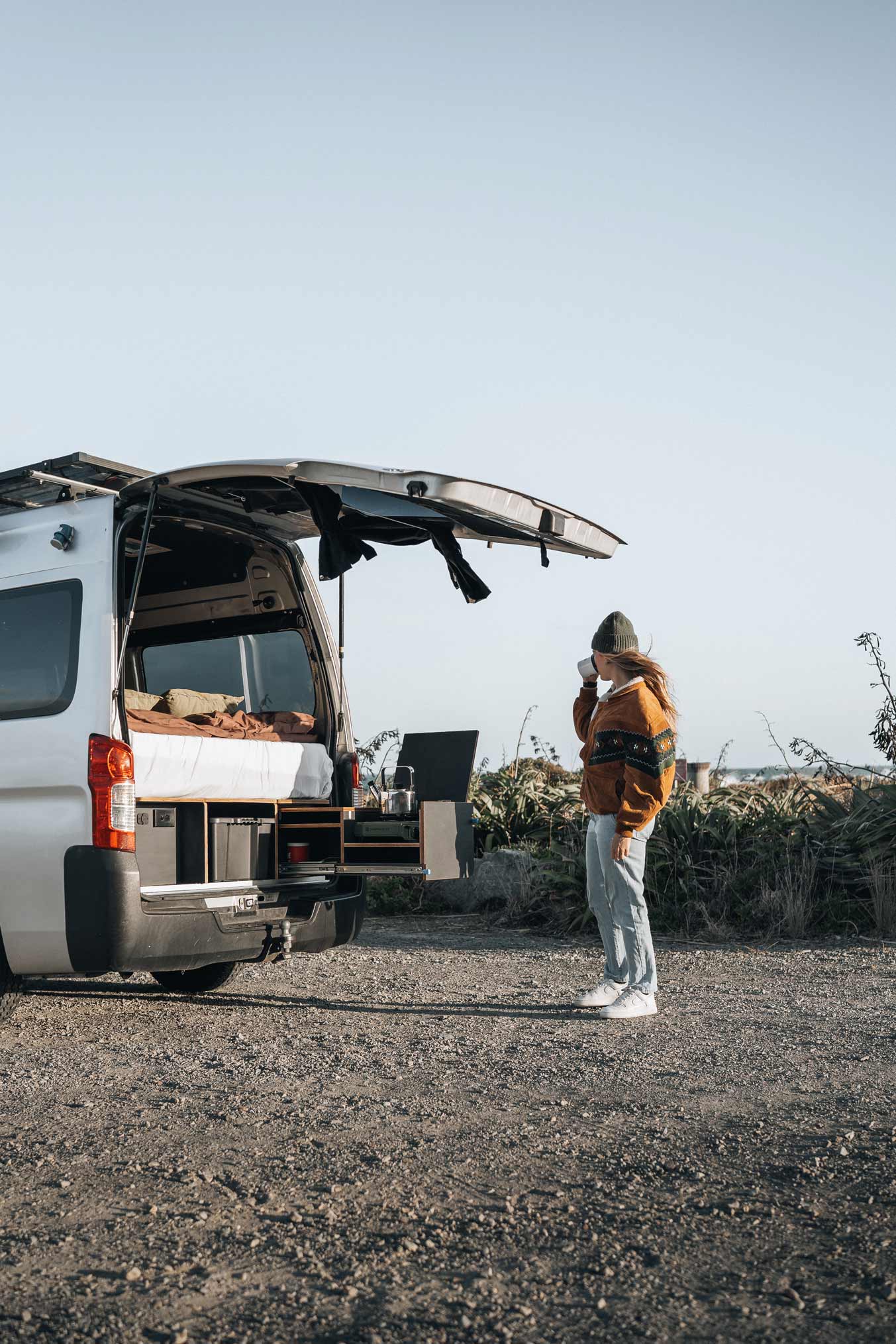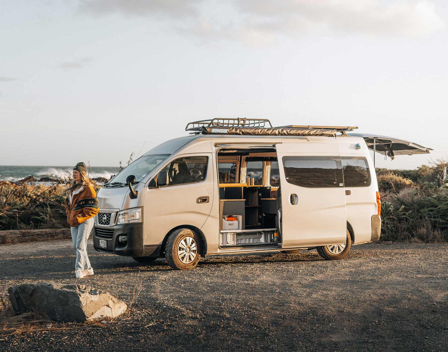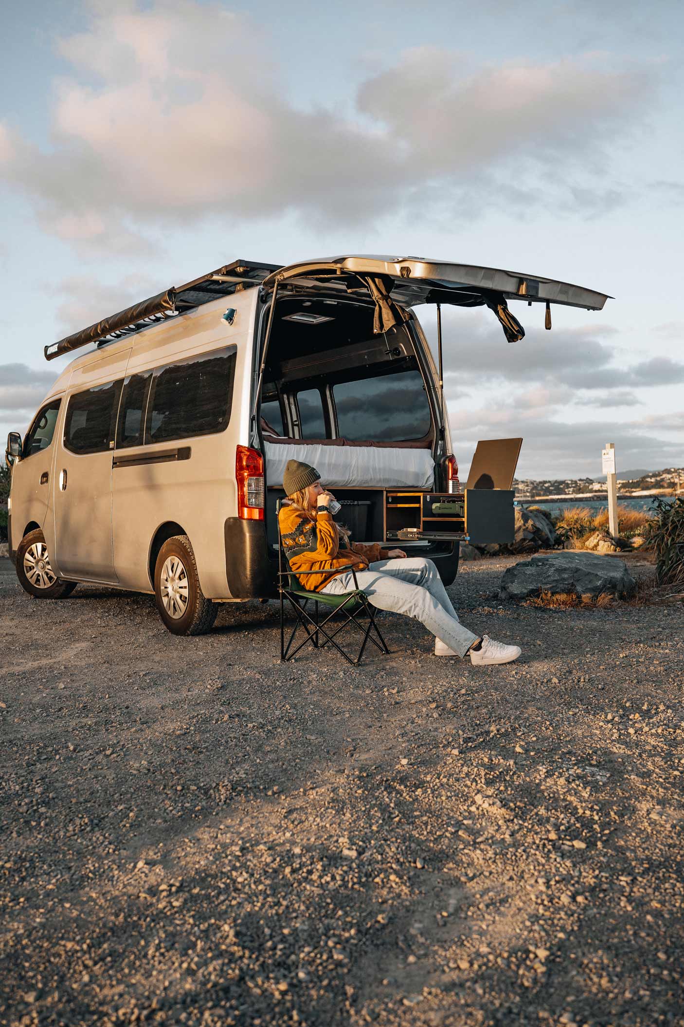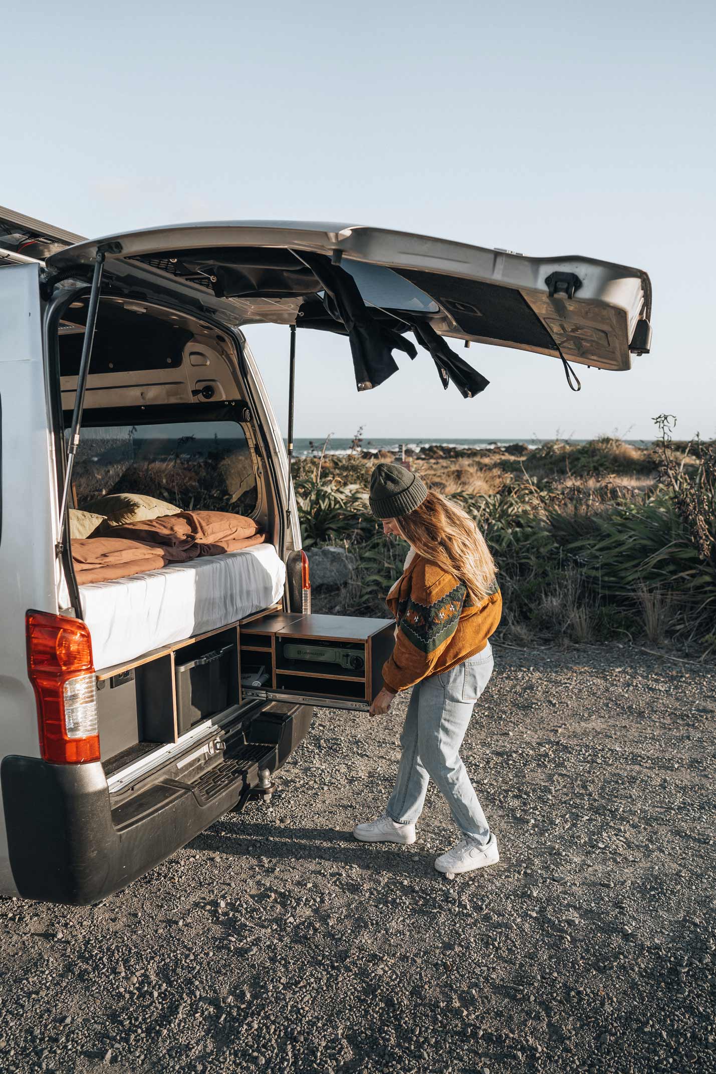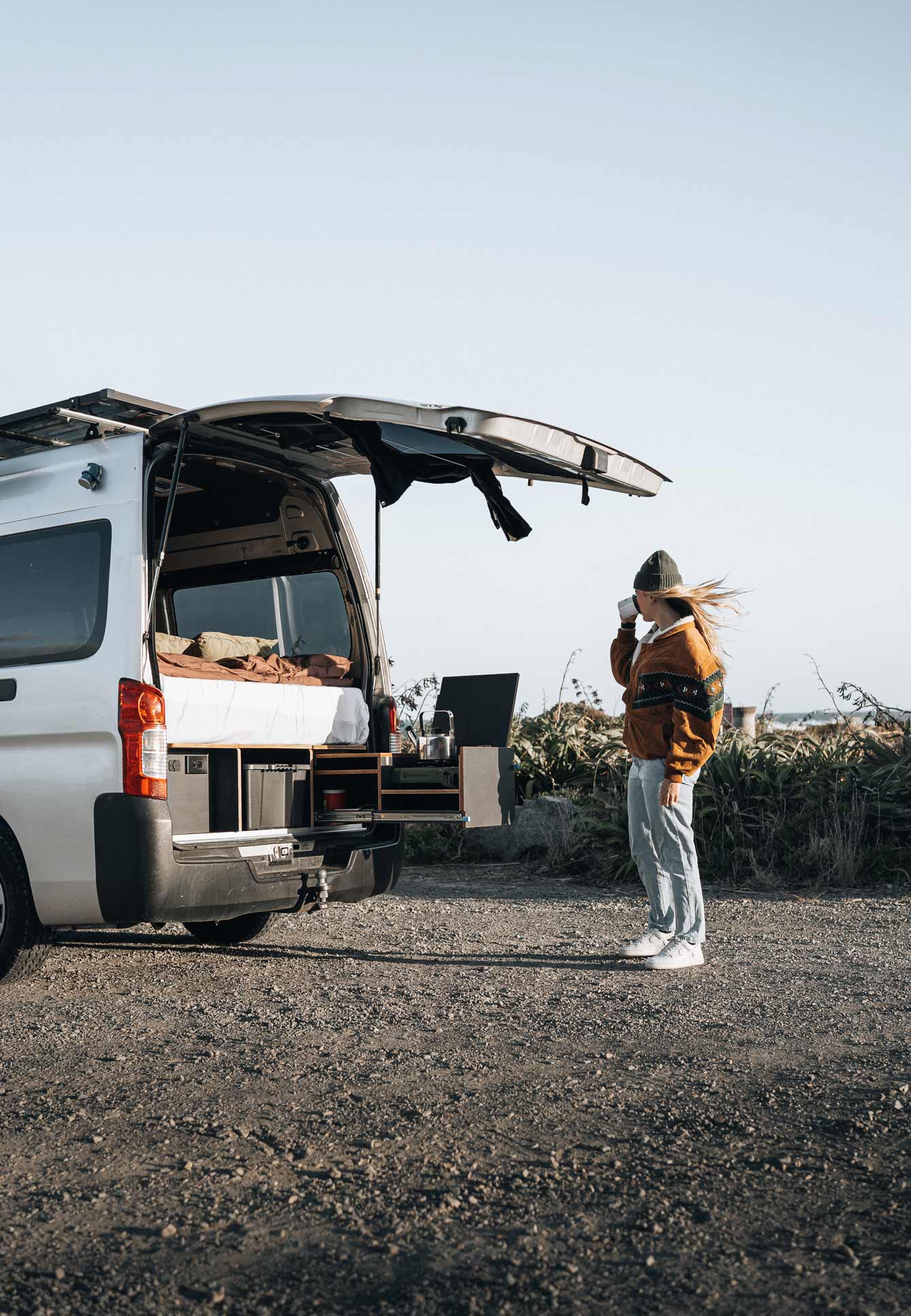She chose a Nissan NV350 high-roof van, a vehicle known for its reliable size-to-function ratio. Not too long, not too bulky — just right for zipping out of town and parking beachside or off the beaten track.