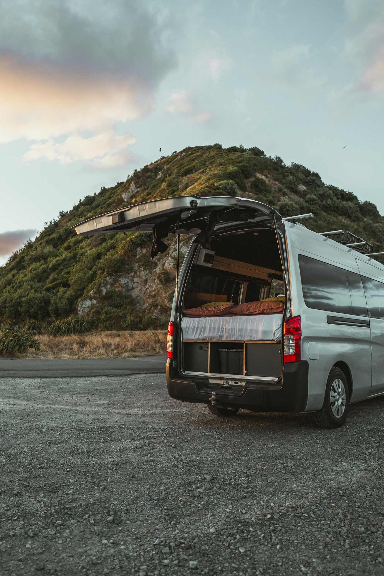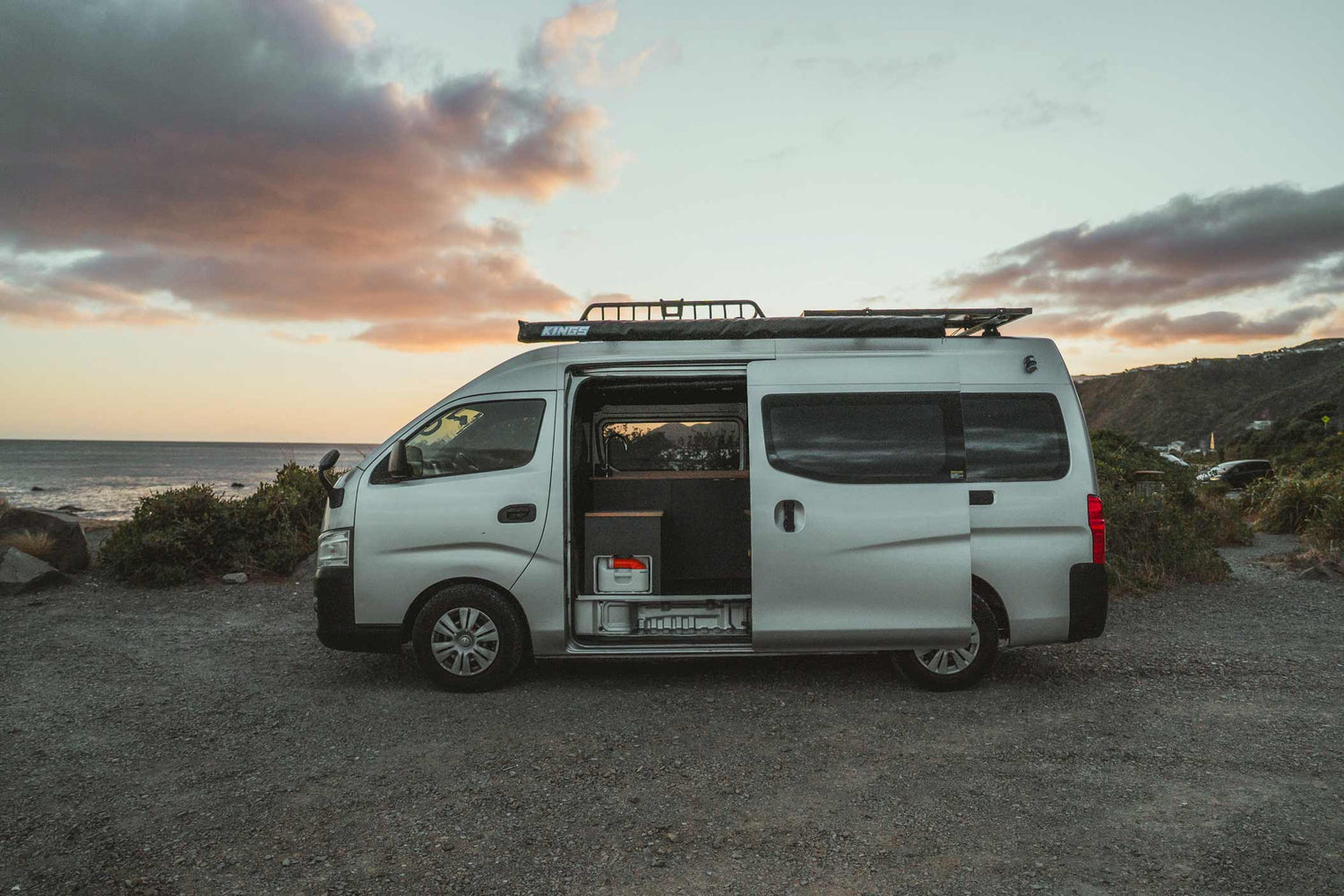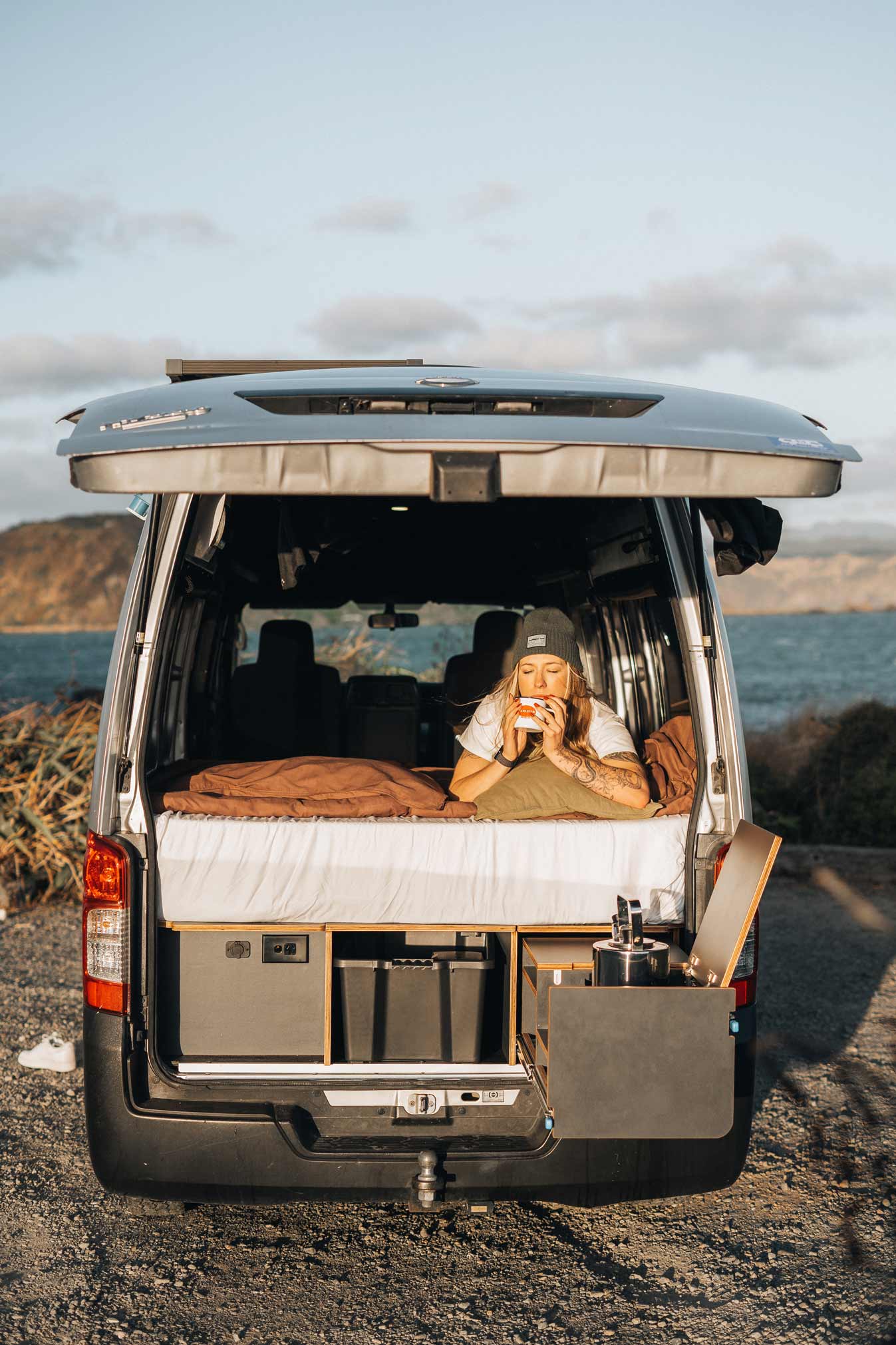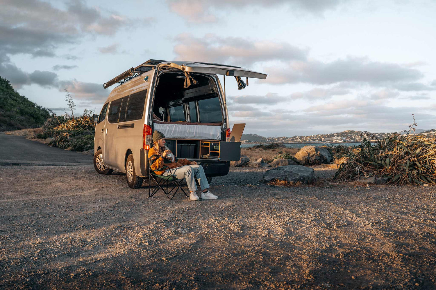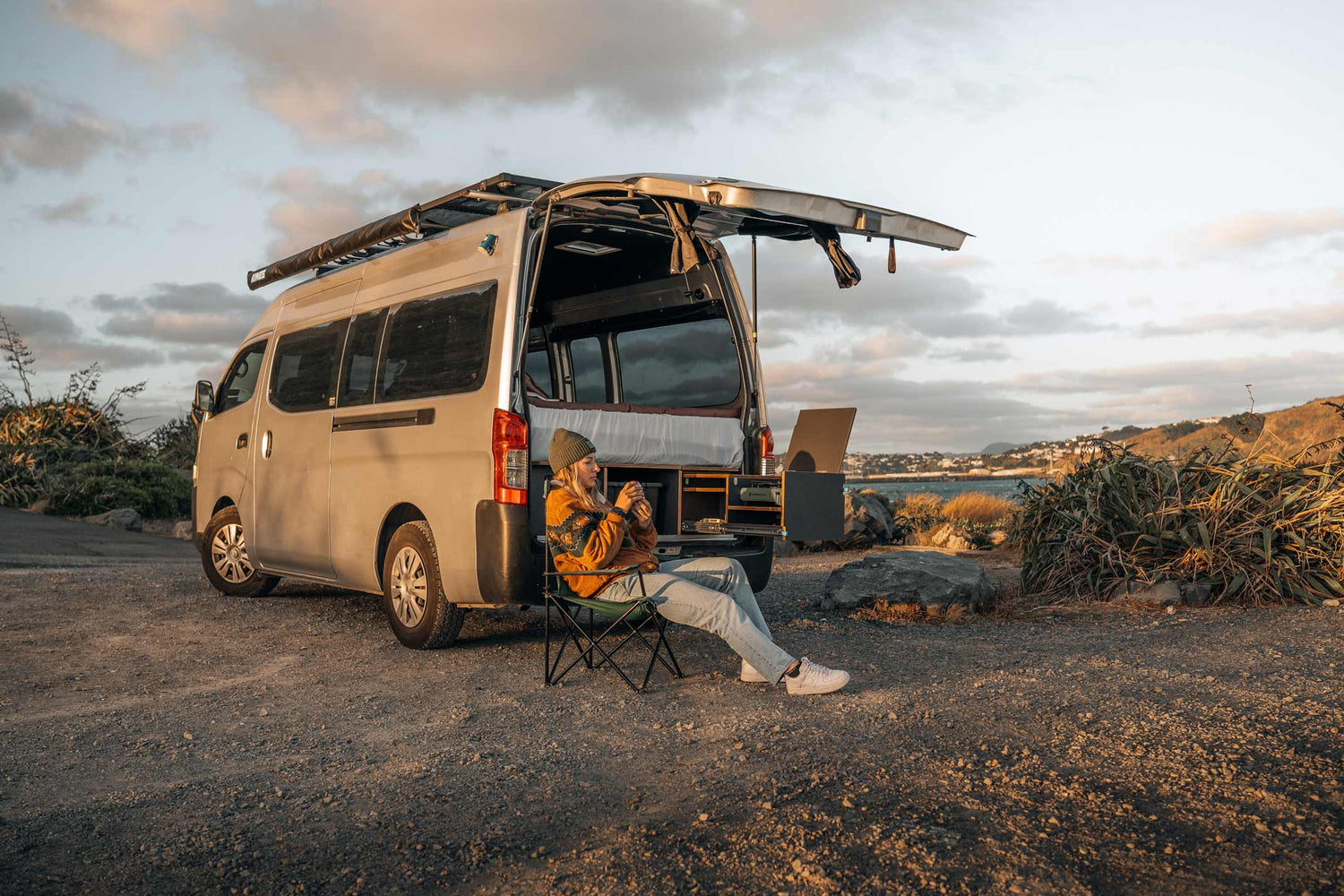 She chose a Nissan NV350 high-roof van, a vehicle known for its reliable size-to-function ratio. Not too long, not too bulky — just right for zipping out of town and parking beachside or off the beaten track.