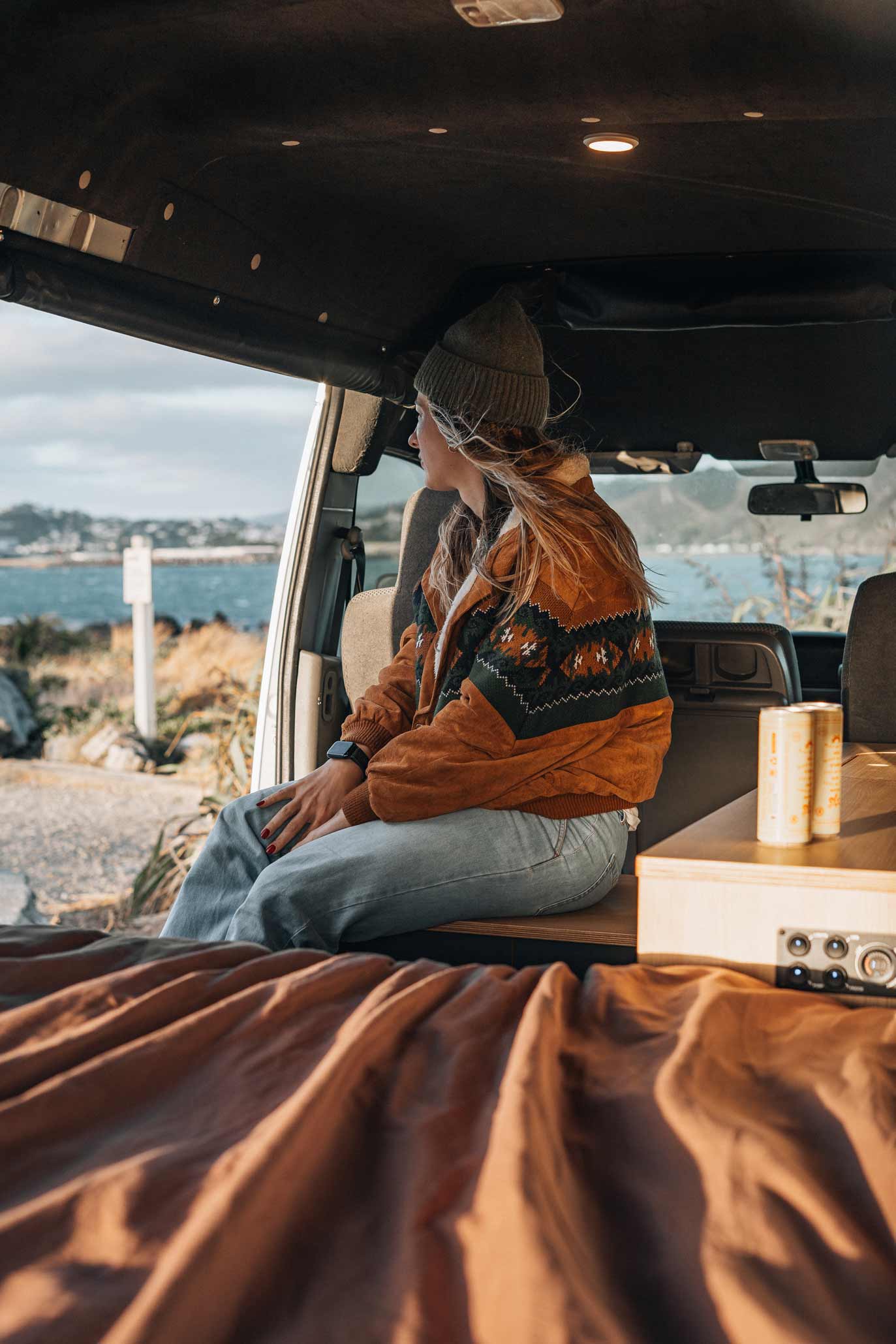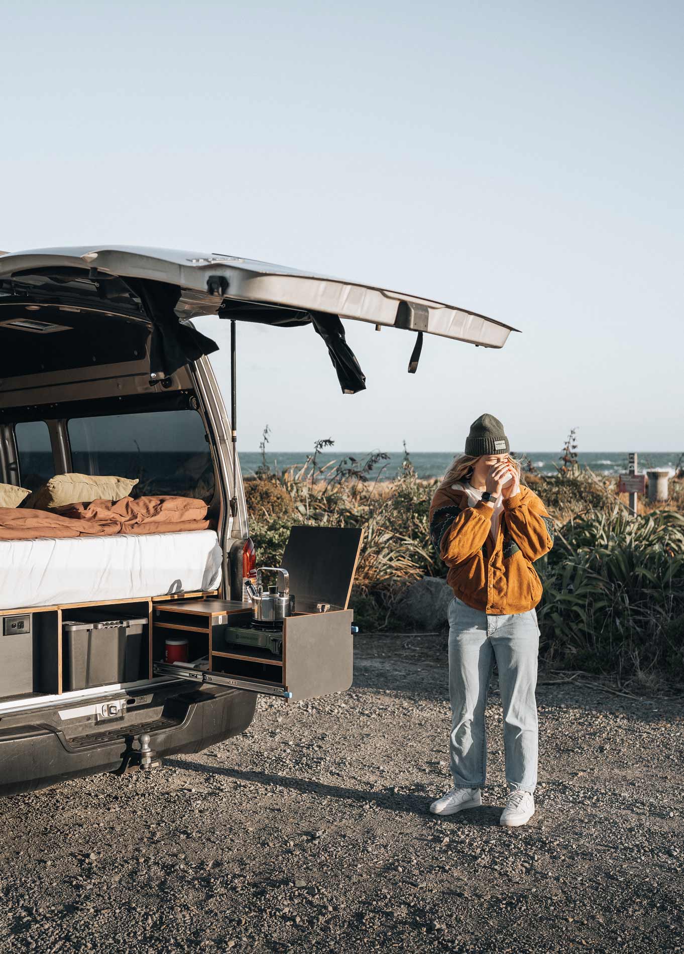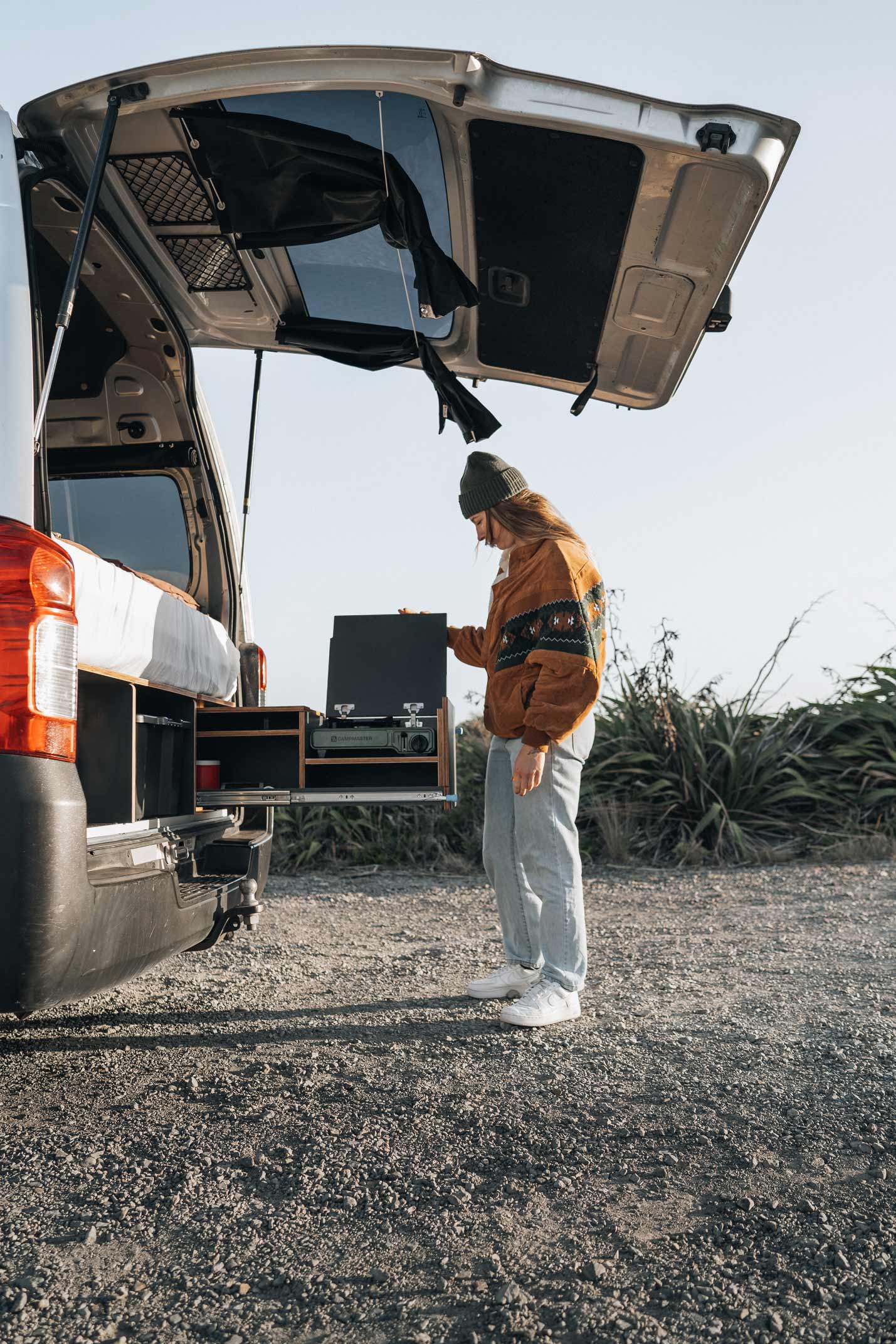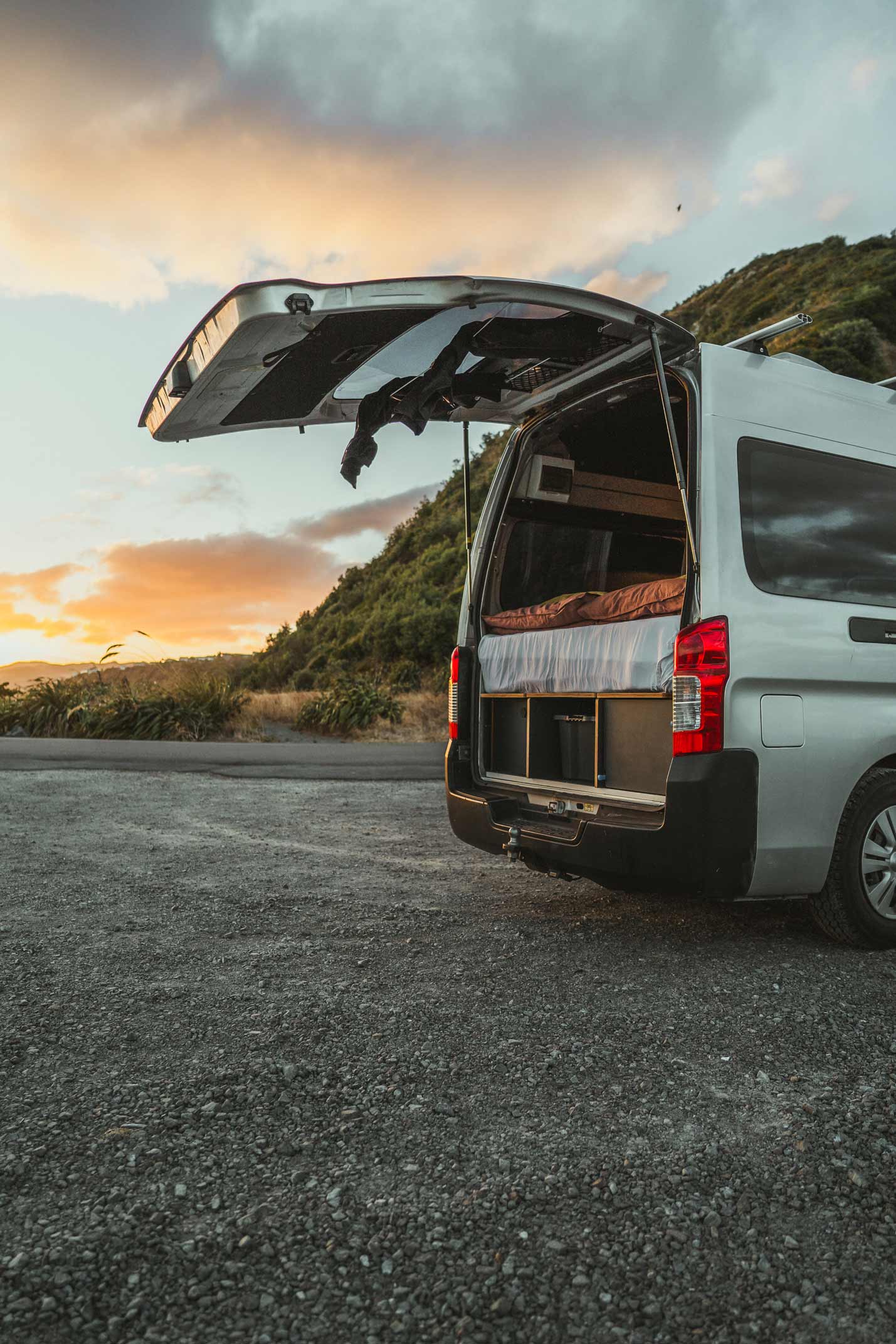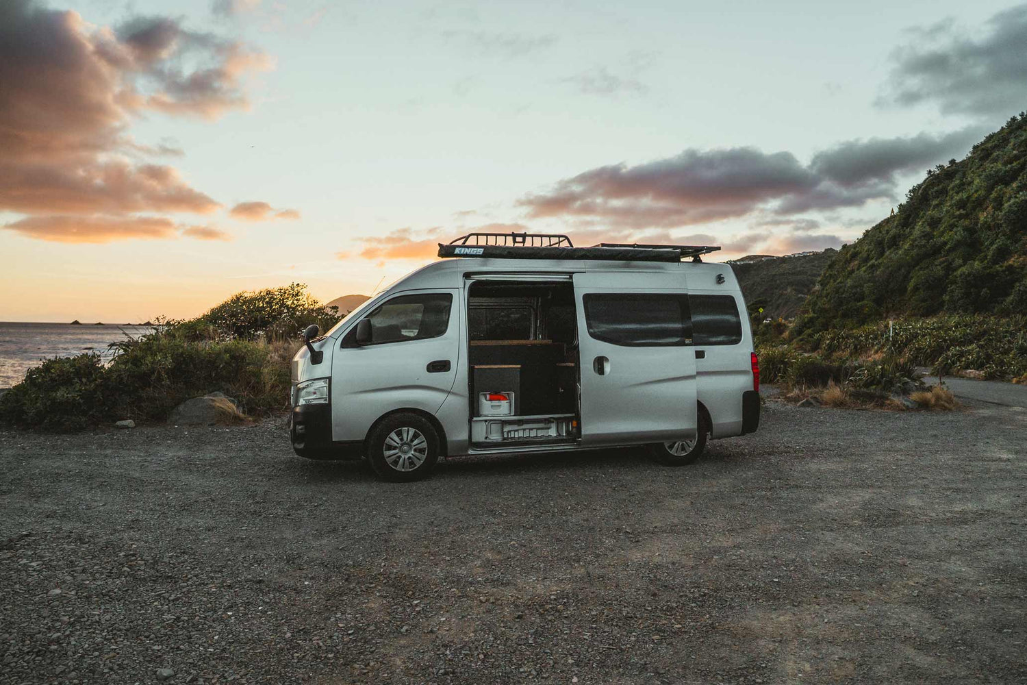 She chose a Nissan NV350 high-roof van, a vehicle known for its reliable size-to-function ratio. Not too long, not too bulky — just right for zipping out of town and parking beachside or off the beaten track.