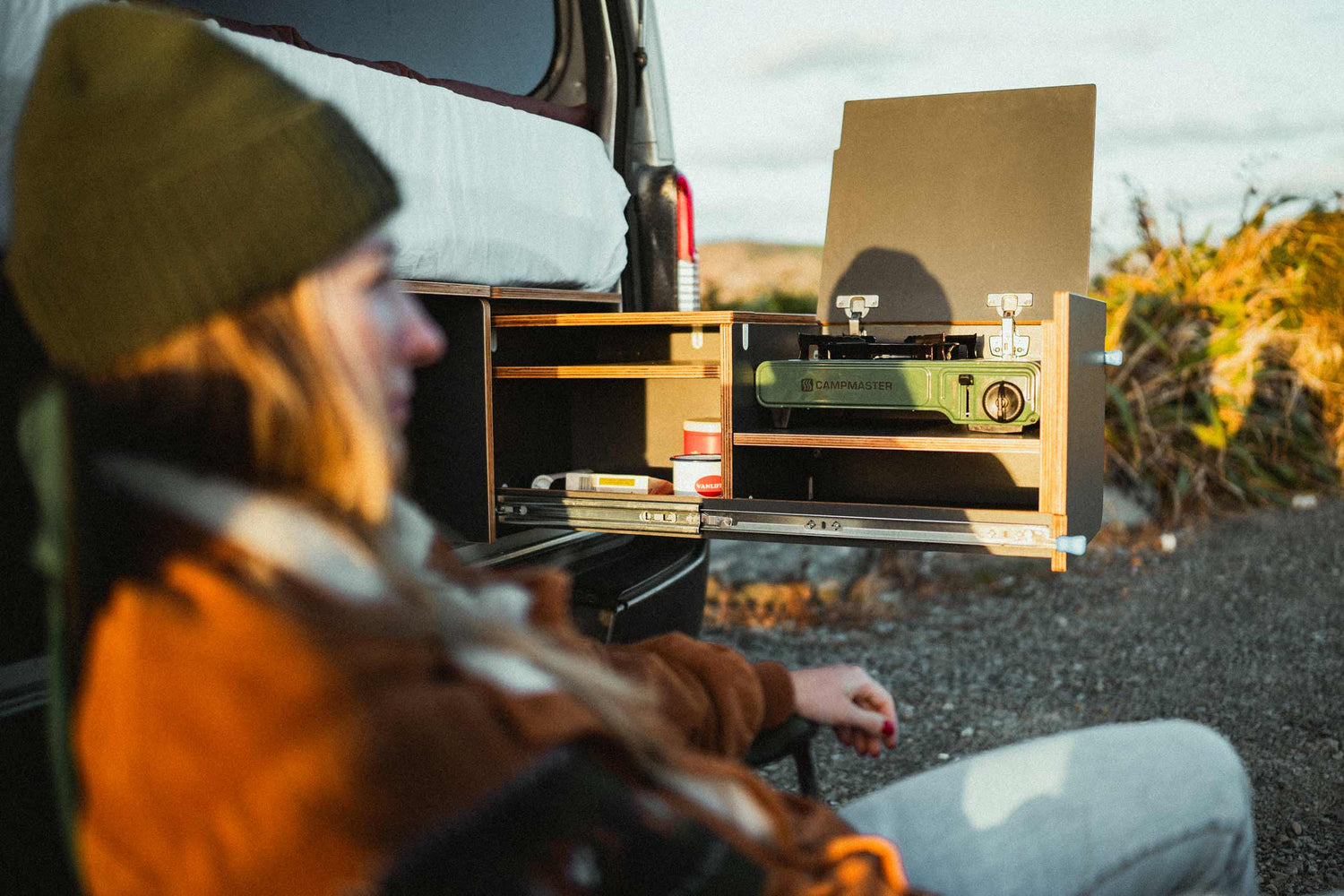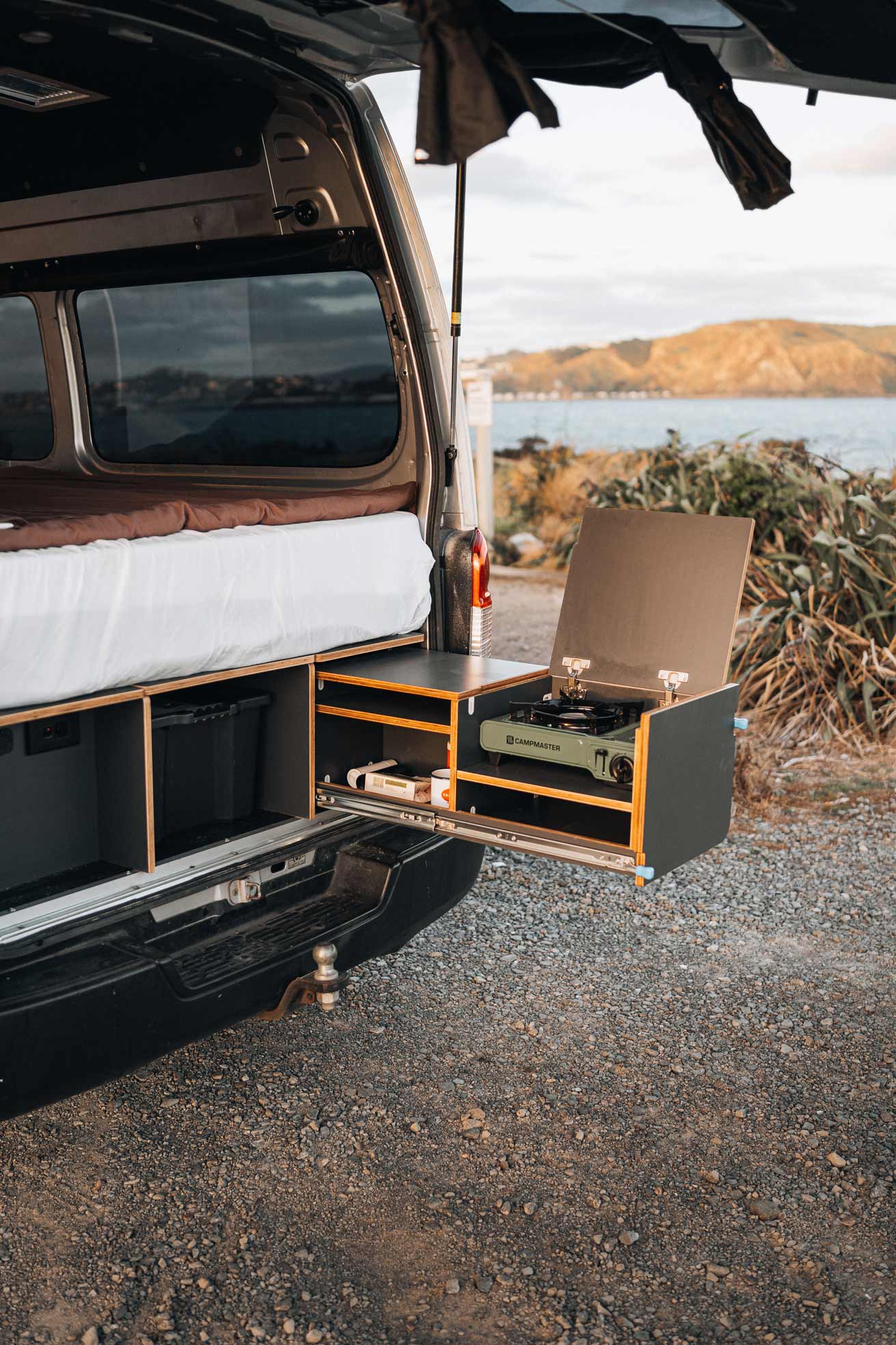 Cooking? That happens under the rear door, with a slide-out drawer system that holds a cooker and doubles as a food prep space. No clutter in the cabin — just easy access to gear where it matters, with the van itself acting as shelter when the weather rolls in.