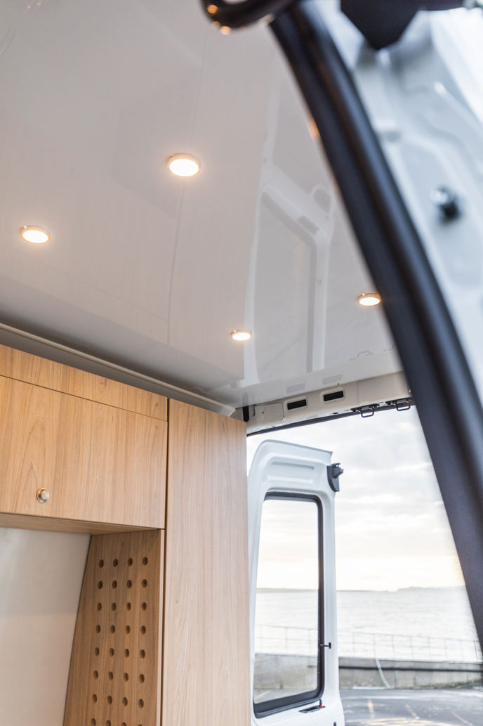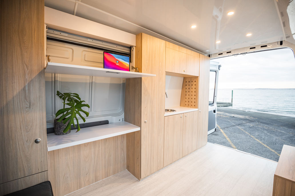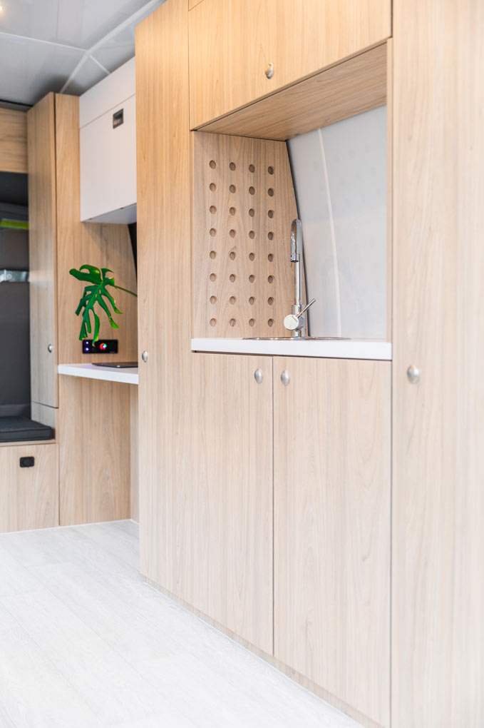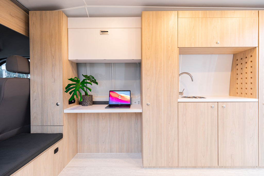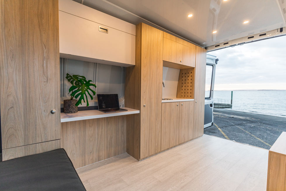 Built around a central fold-down standing desk, the interior was designed to feel more like a modern clinic than a converted van. White-washed ply cabinetry with push-to-open drawers keeps things streamlined, while ACM wall linings and commercial-grade vinyl flooring ensure every surface is hygienic, hard-wearing, and easy to clean.