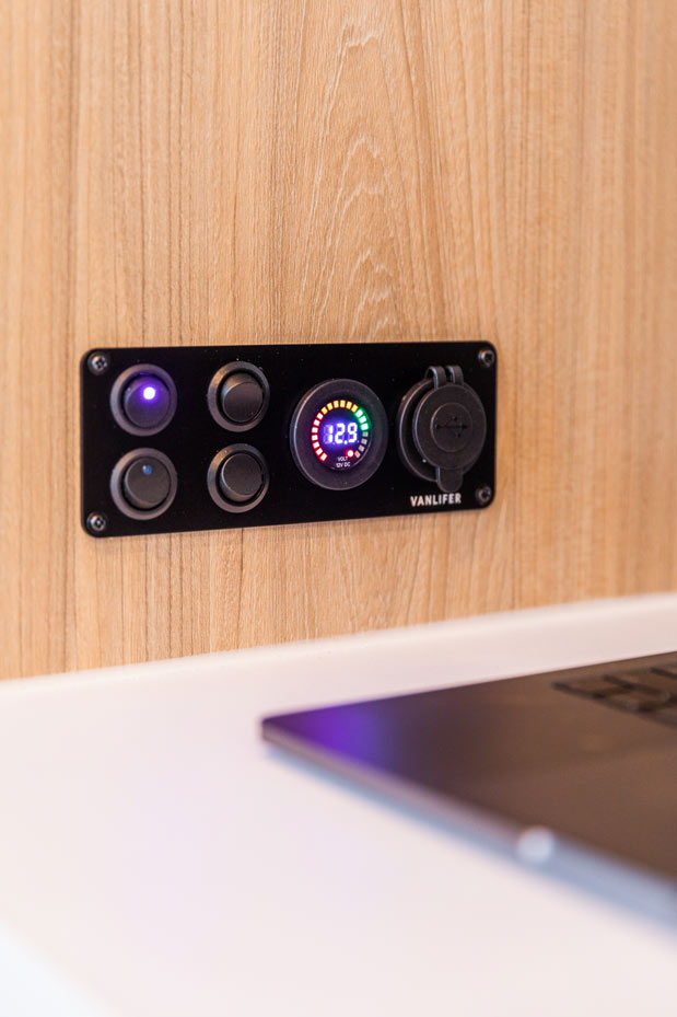 To keep laptops charged and lights running throughout the day, the van includes a 120 Ah battery system with a Projecta DC–DC charger, which tops up the power while driving between appointments. It’s an ideal setup for running a mobile office without needing constant access to shore power — perfect for rural clinics, sports grounds, or parked up at events.