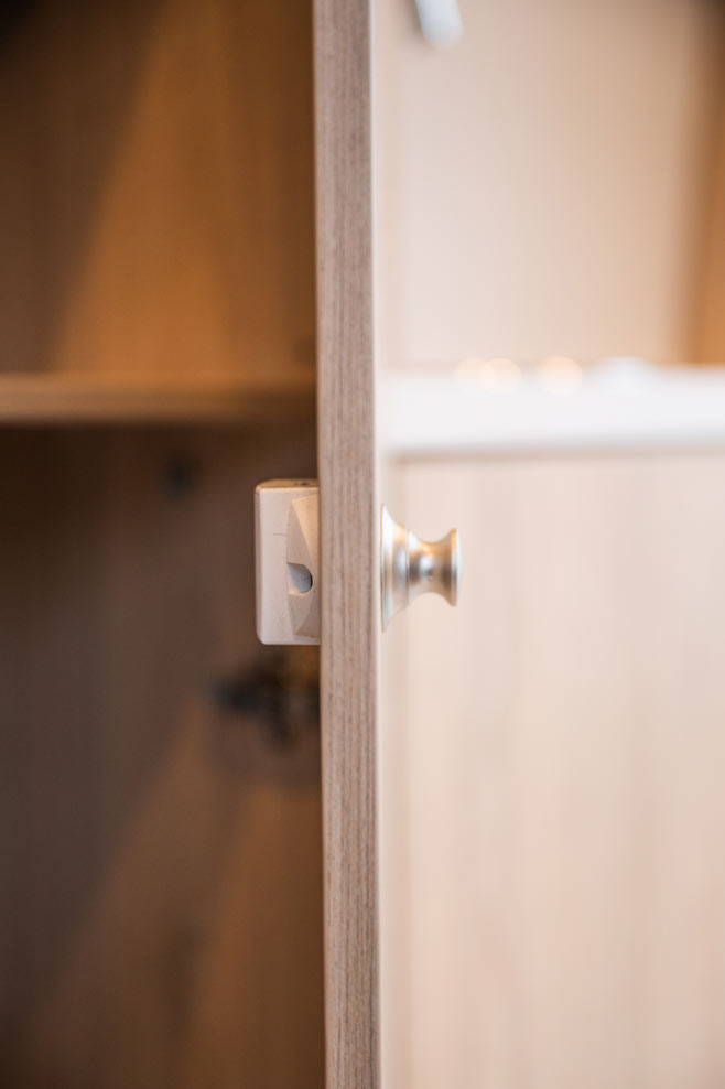 A padded bench seat offers additional storage beneath, and a cold-water handwashing sink was integrated into the cabinetry. To maintain privacy and warmth without blocking natural light, Rosie and Rhys opted for fitted cab-divider blinds instead of a solid wall — a thoughtful touch that elevates the overall feel of the van.