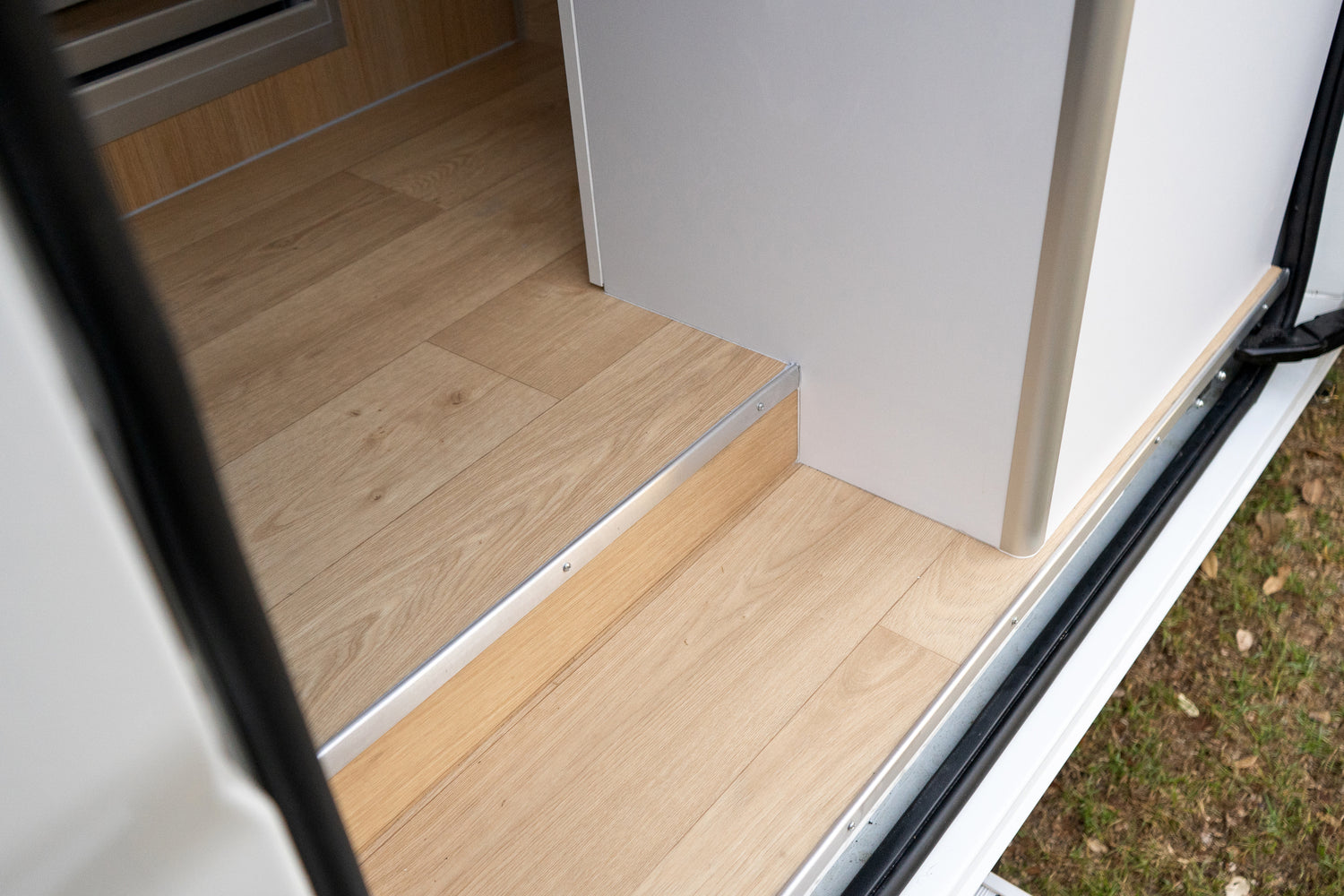 Built to withstand heavy use, the vinyl flooring not only looks professional but also stands up to the wear-and-tear of a conversion van built for rentals.