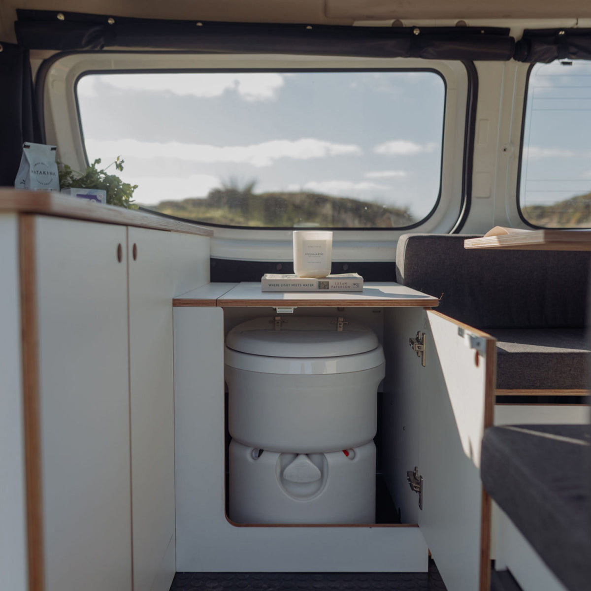 The benches can be used as two single beds (1850mm x 520mm each), or quickly converted into a spacious double bed (1850mm x 1500mm). There’s space for a compact 12V fridge, and a dedicated location for a fixed toilet like the Black Moa — making this kit ideal for fully self-contained travel.