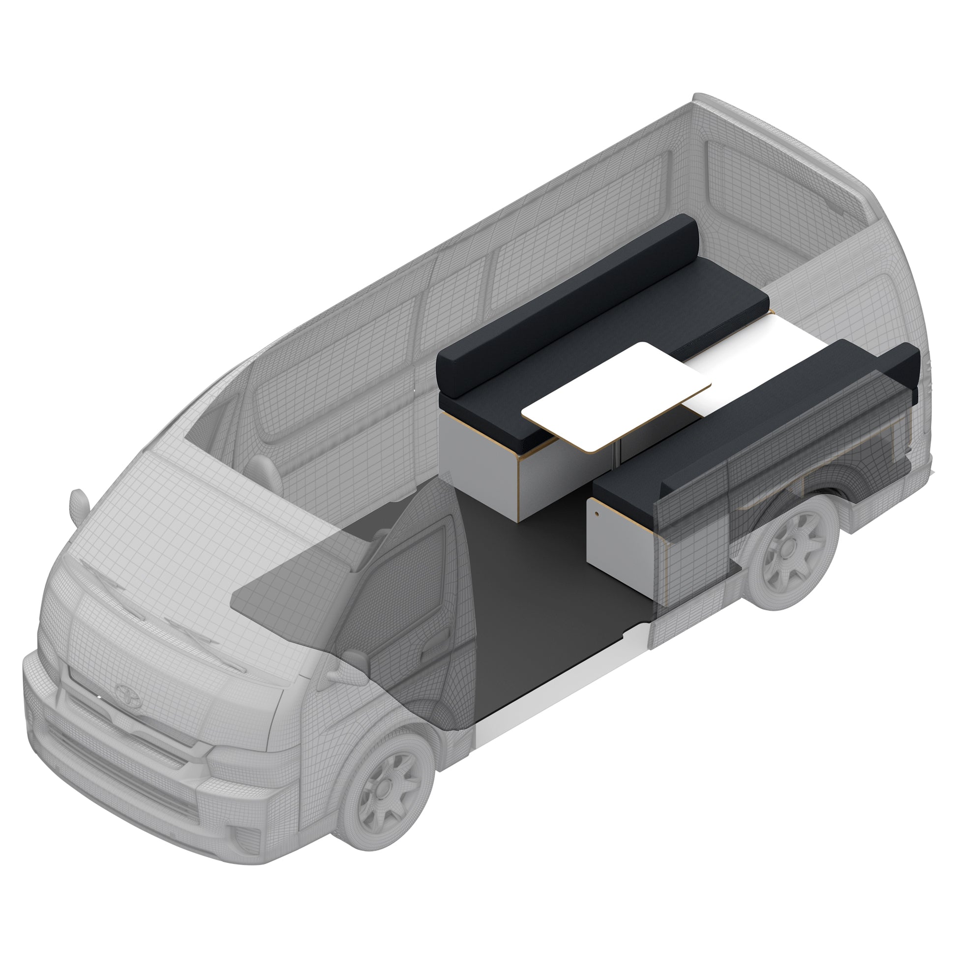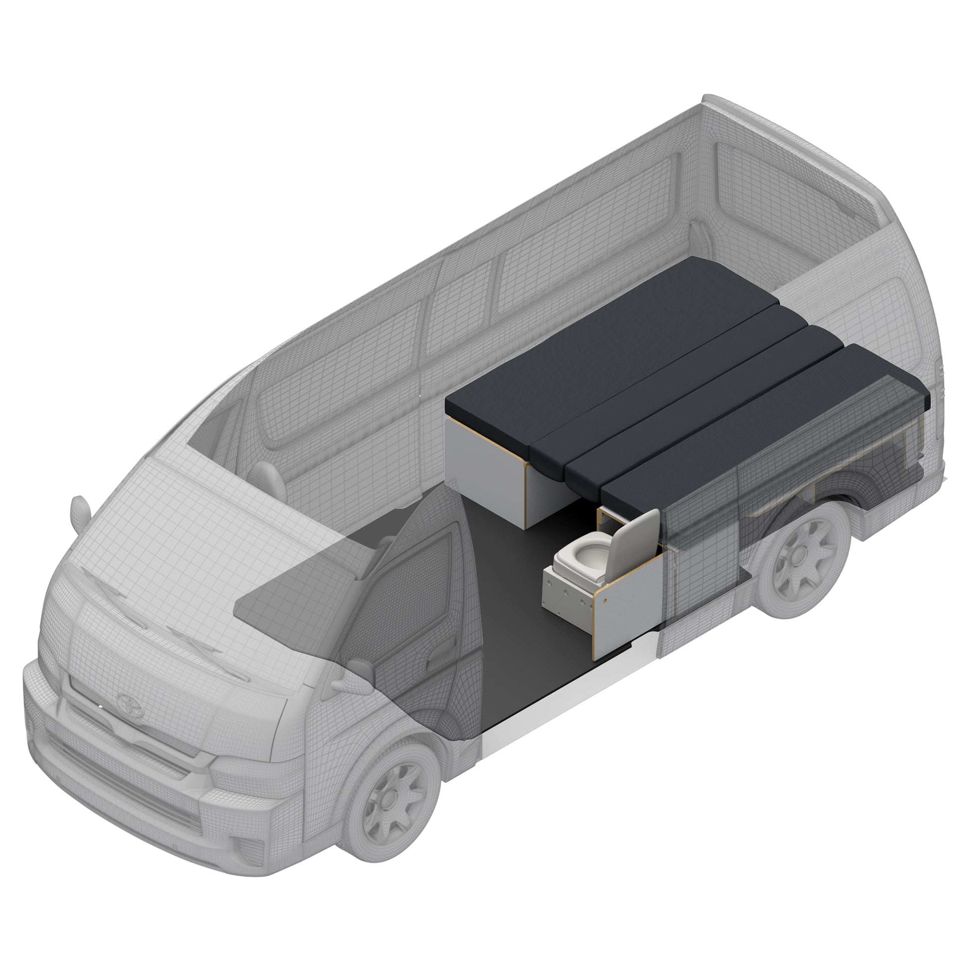 The Kawatiri kit is a simple, versatile campervan conversion designed for easy weekends away. It’s our rear-bed layout for wide-body vans like the Toyota Hiace Commuter, which allows you to convert it into a practical 2 berth campervan with a relaxed living space by day and a comfortable sleeping setup at night.