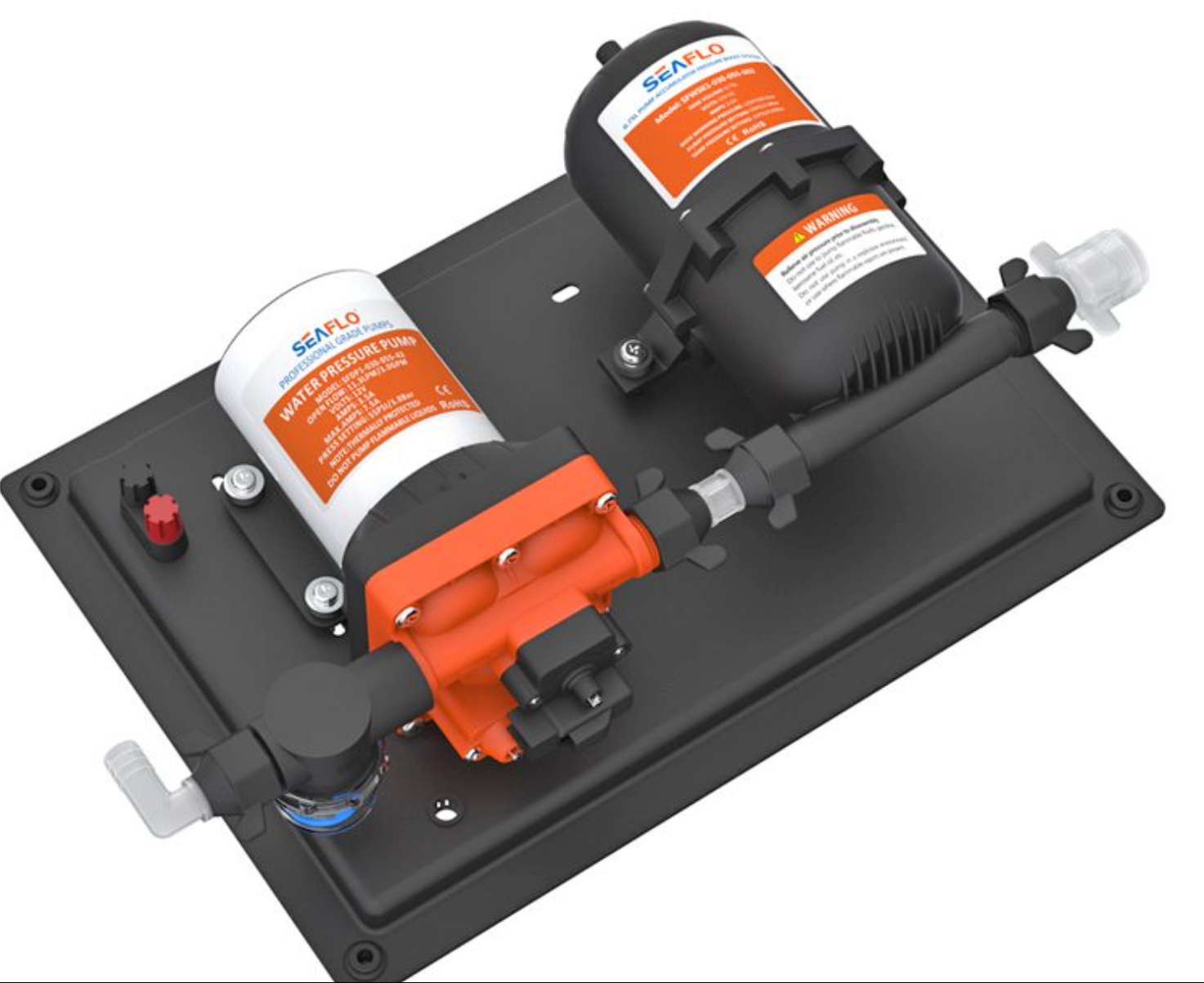 The Seaflo Water Pressure System 11.3LPM 24V offers a complete, ready-to-install solution for efficient water pressure management. It features a 4-chamber diaphragm pump, integrated strainer, and a 0.75L pre-pressurized accumulator tank mounted on a sturdy plate with quick-connect electrical fittings. Designed to supply three or more 1/2" outlets, it delivers a steady 3.0 GPM (11.3 LPM) flow with pressure cycling between 45 PSI (3.1 BAR) and 55 PSI (3.8 BAR). Constructed with durable EPDM valves and a Santoprene diaphragm, this system ensures quiet, reliable operation for professional and amateur use alike.